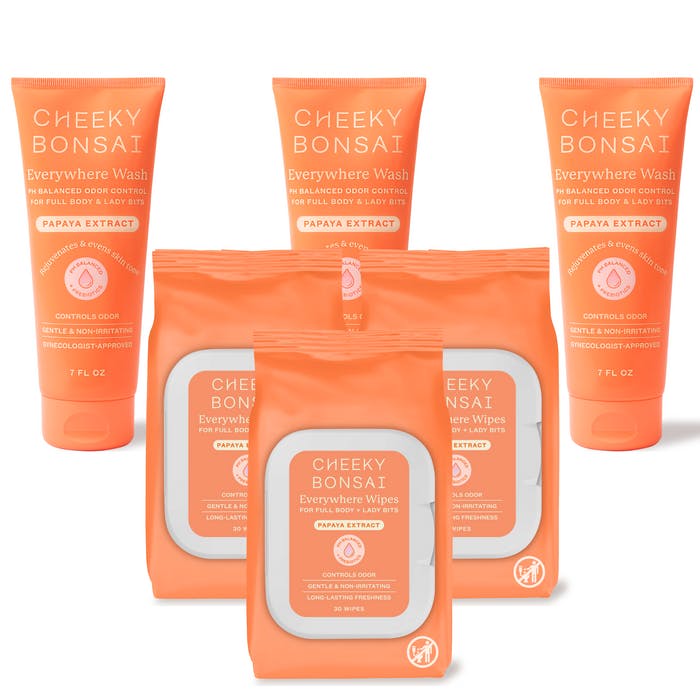 Cheeky Bonsai Everywhere Wipes target odor from pits to lady bits.The pH-balanced formula blends clean, odor-fighting ingredients—prebiotics and papaya lactobacillus—to maintain vaginal pH and moisture in one swipe. Gyno-approved, our wipes minimize odor and gently refresh.